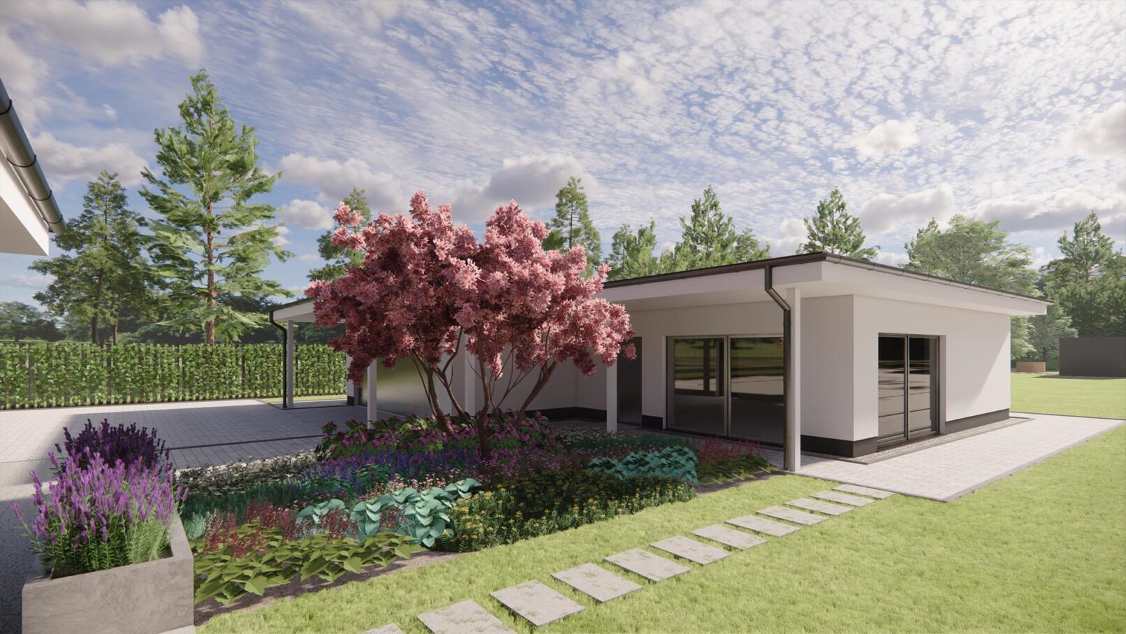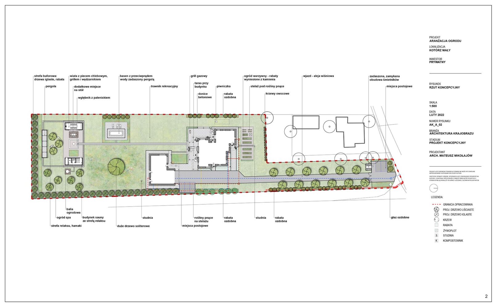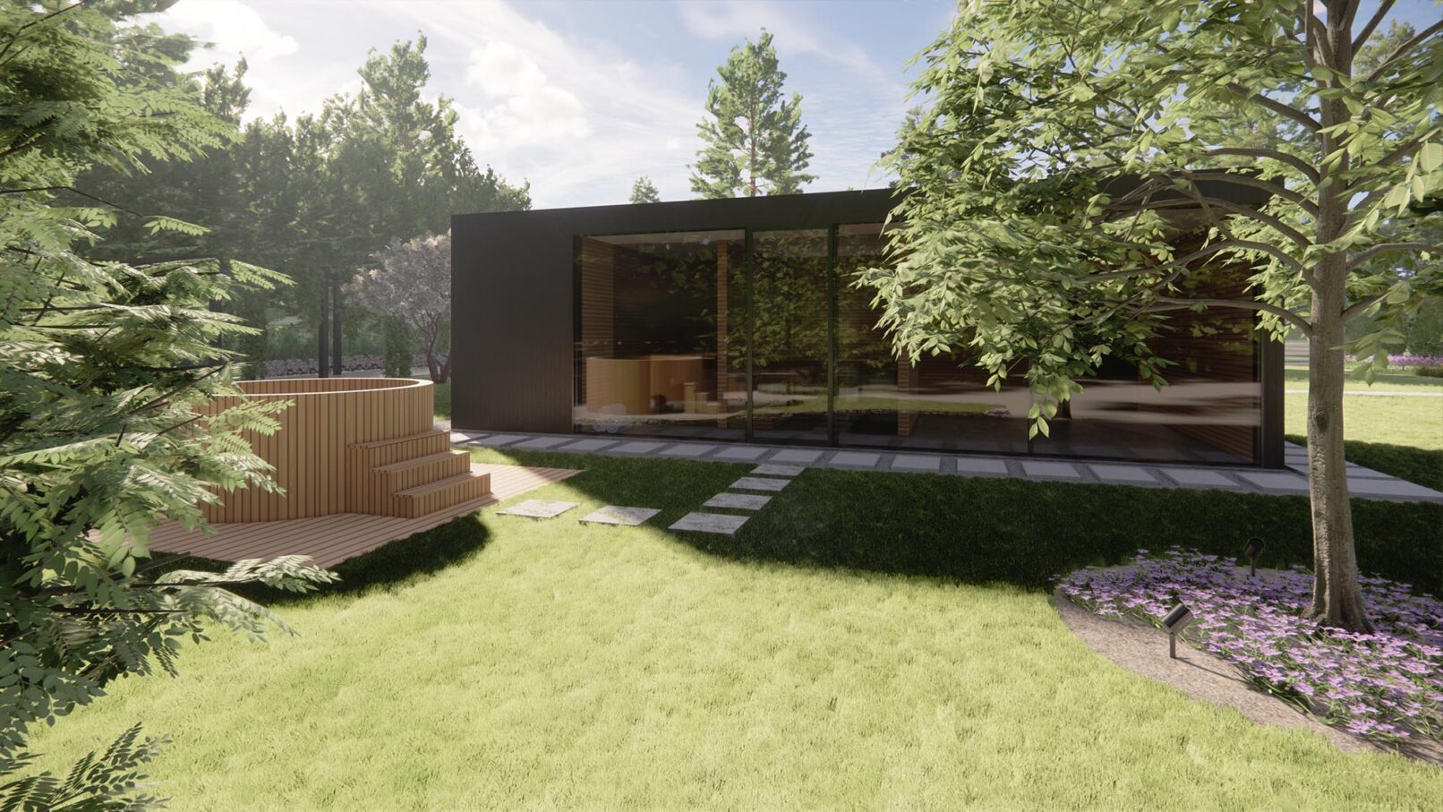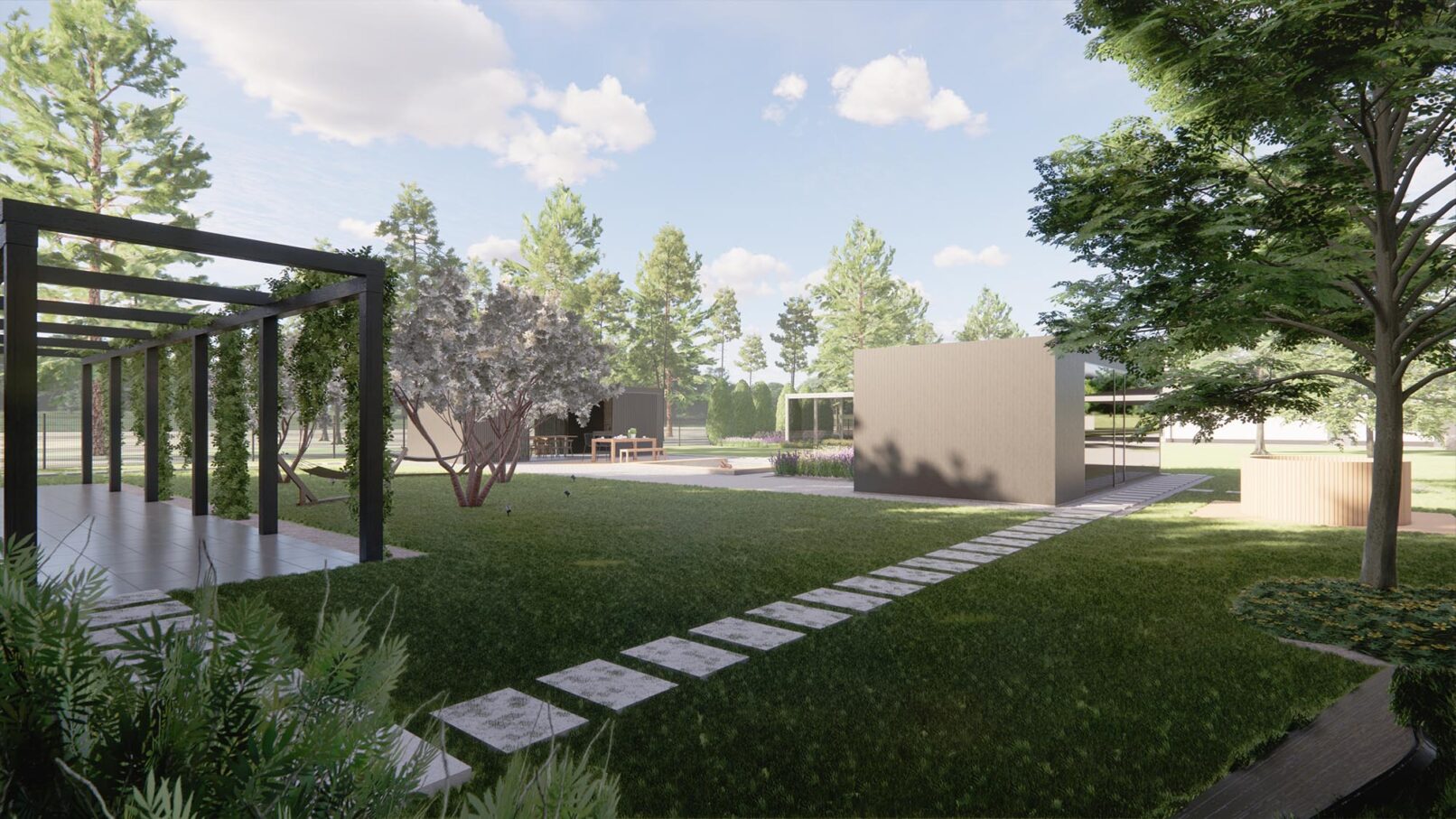 Projekt nowoczesnego ogrodu przydomowego w pięknej, leśnej okolicy. Działka została podzielona funkcjonalnie na różne strefy, wśród których znalazły się: strefa wejściowa z aleją wiśni, strefa tarasów, piwniczka na wino, ogród warzywny z podniesionymi grządkami, strefa basenu, wgłębnik z miejscem na ognisko, wiata z grillem i strefa spa z sauną ogrodową.