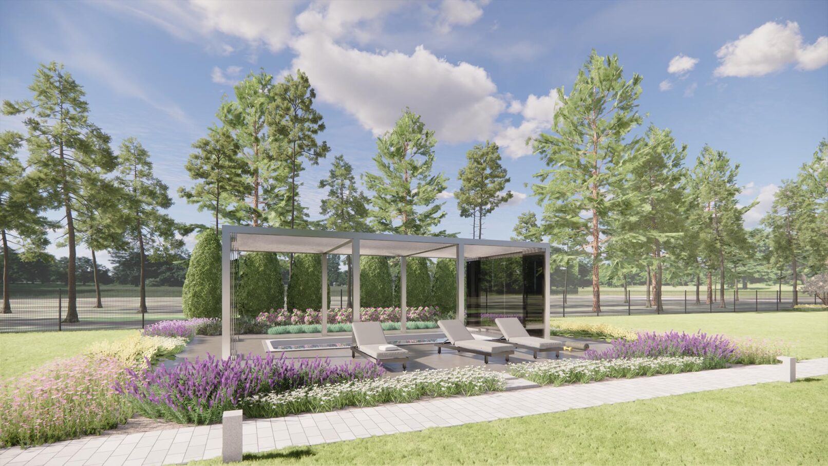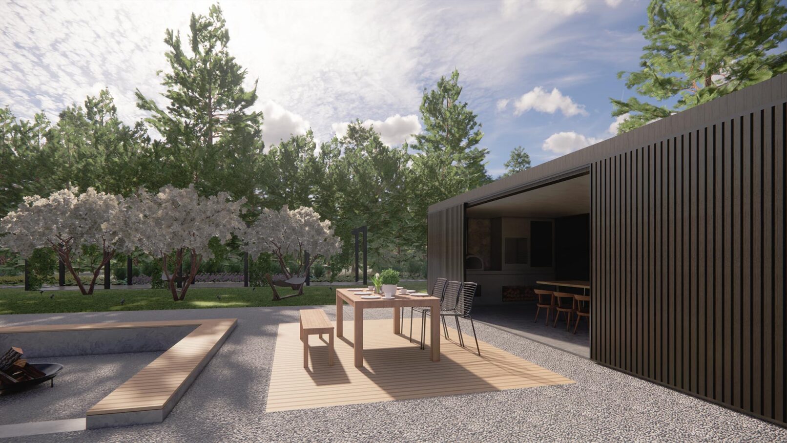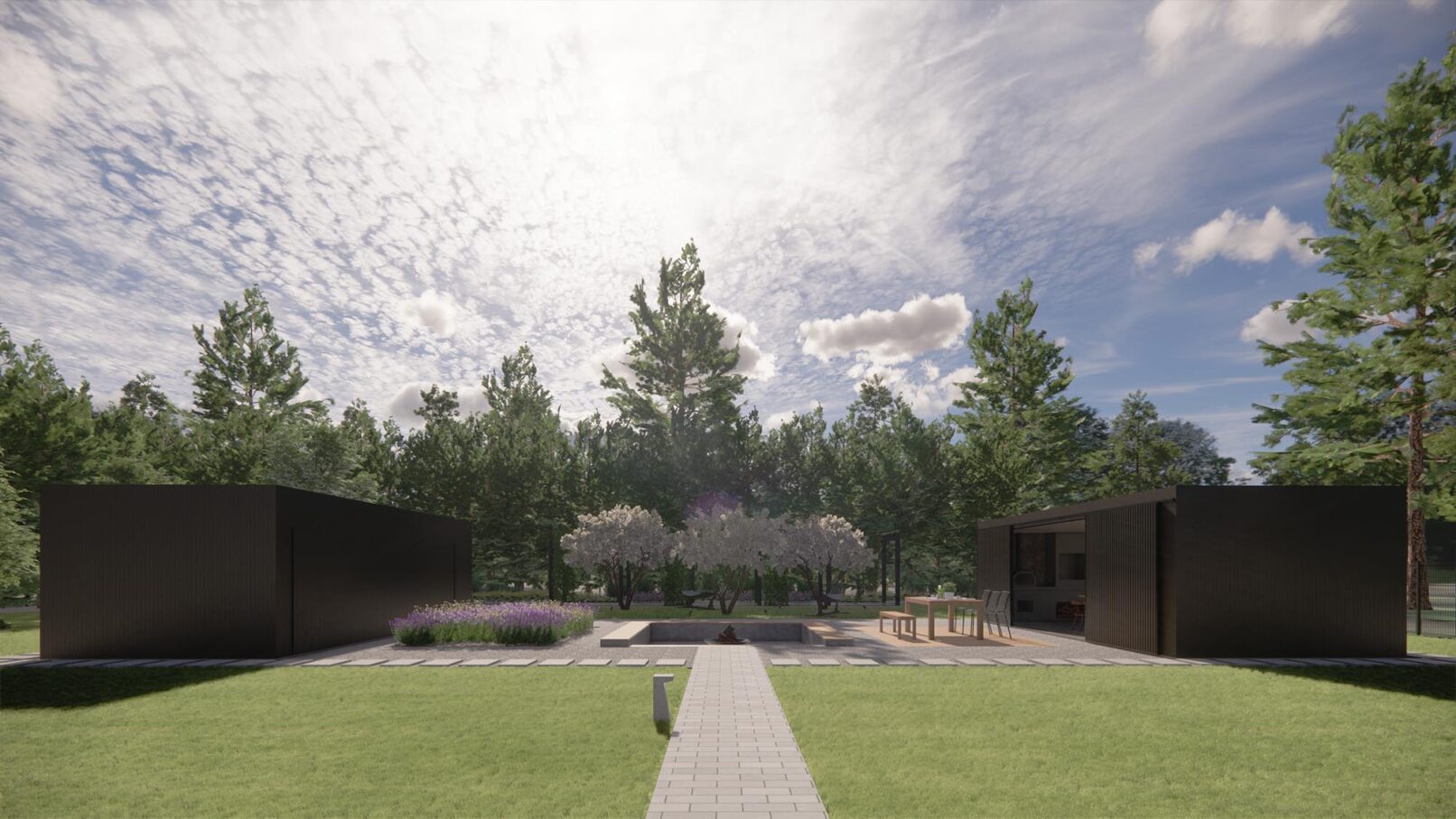 Projekt nowoczesnego ogrodu przydomowego w pięknej, leśnej okolicy. Działka została podzielona funkcjonalnie na różne strefy, wśród których znalazły się: strefa wejściowa z aleją wiśni, strefa tarasów, piwniczka na wino, ogród warzywny z podniesionymi grządkami, strefa basenu, wgłębnik z miejscem na ognisko, wiata z grillem i strefa spa z sauną ogrodową.