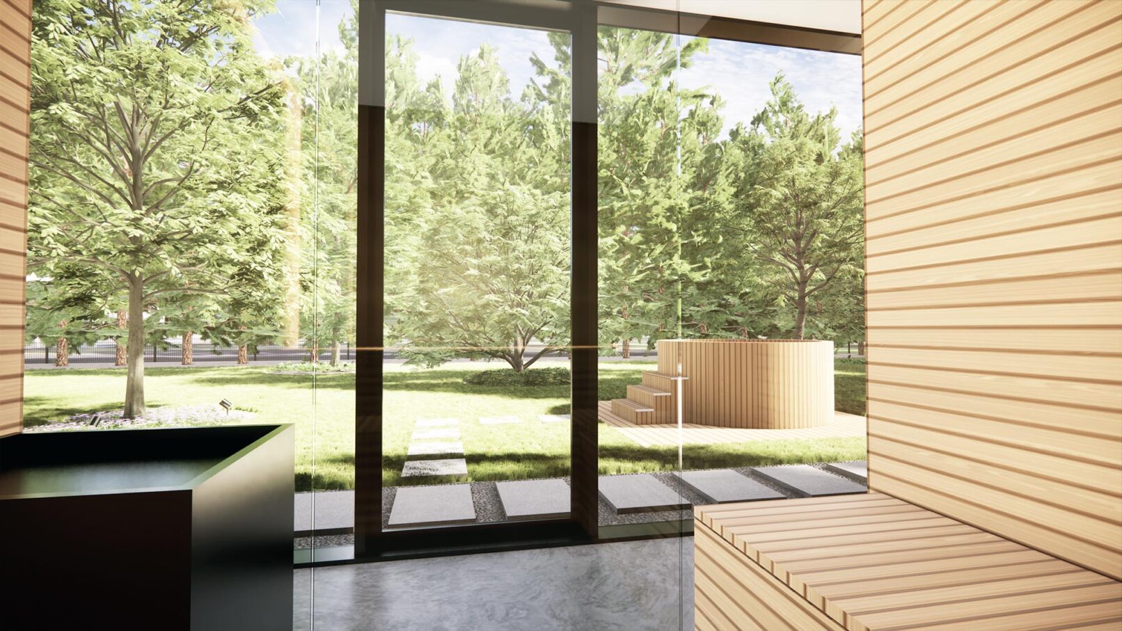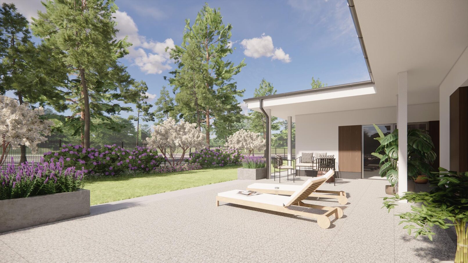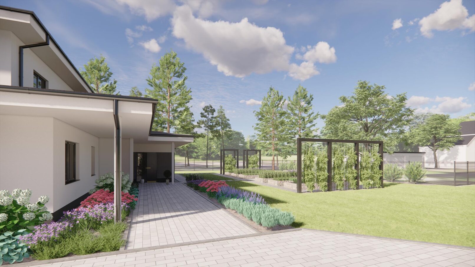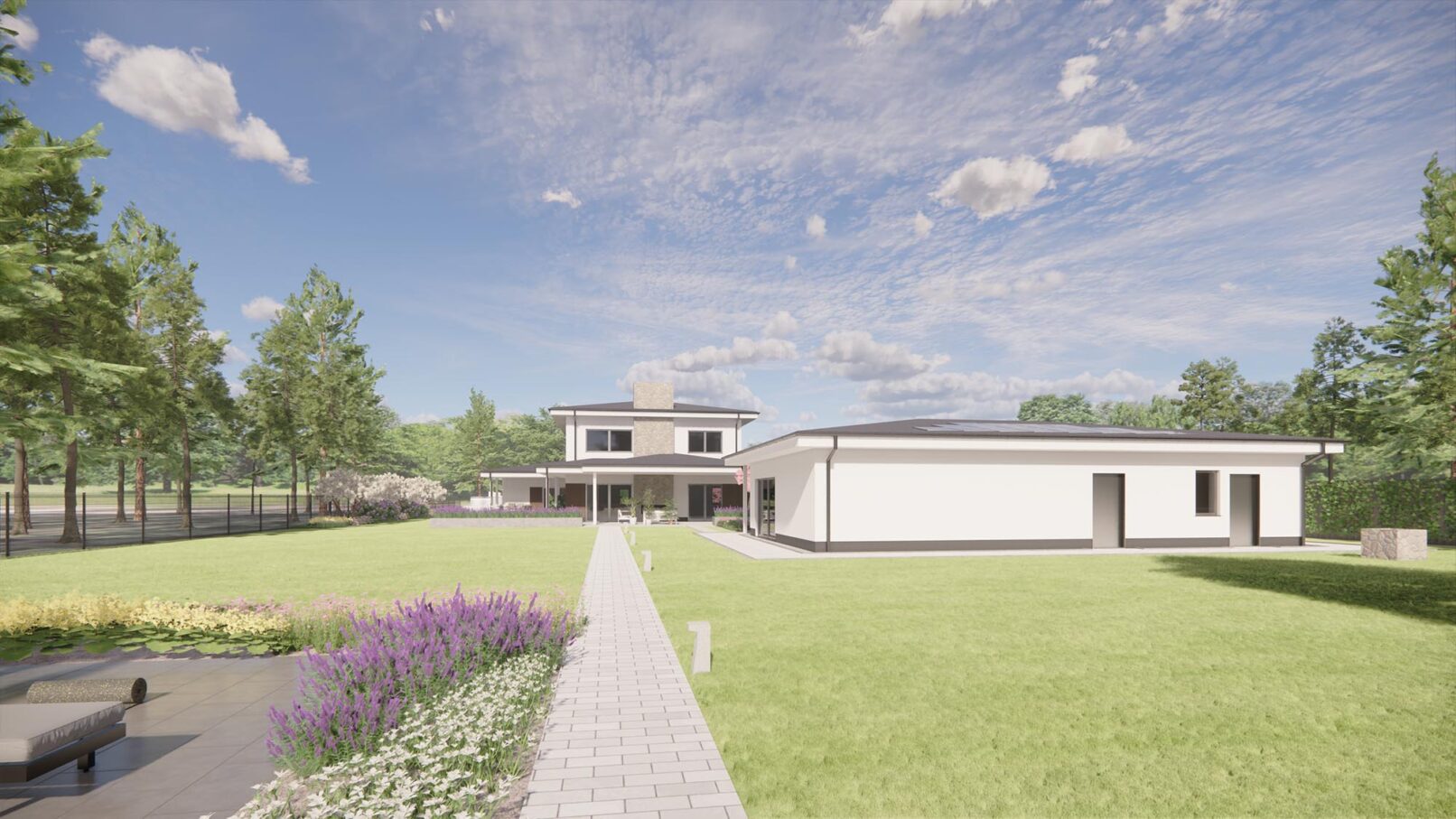 Projekt nowoczesnego ogrodu przydomowego w pięknej, leśnej okolicy. Działka została podzielona funkcjonalnie na różne strefy, wśród których znalazły się: strefa wejściowa z aleją wiśni, strefa tarasów, piwniczka na wino, ogród warzywny z podniesionymi grządkami, strefa basenu, wgłębnik z miejscem na ognisko, wiata z grillem i strefa spa z sauną ogrodową.